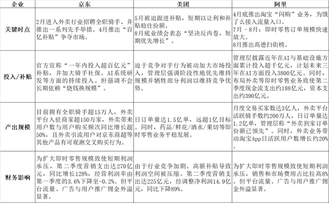 表1 京东、美团、阿里在外卖业务方面的表现对比