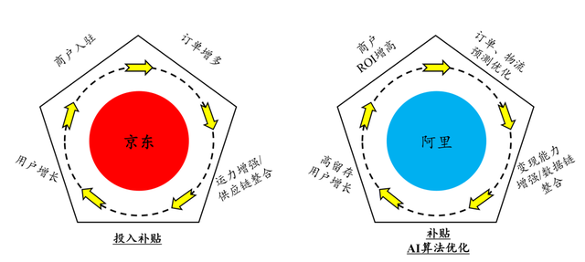 与京东相比,阿里的优势除了更为庞大、成熟的生态系统外,还在于其很好地将AI算法优化了外卖补贴。京东还在使用“粗放补贴”的逻辑时,阿里已经更进一步,用起了AI算法补贴。具体来说,阿里系的其他应用提供了海量的用户行为数据,这使得阿里的AI算法能根据已有数据给出精准的补贴方案。更精准的补贴带来的是更好的用户体验,以及高留存用户的快速增长。在补贴资金相同的情况下,留存率和复购更高意味着商户有更高的ROI,经营效益更好。在消费者和商家都满意的情况下,二者的行为有更平稳向好的预期,因此AI算法能对外卖平台的订单密度和物流配送情况进行更完善的预测和优化。