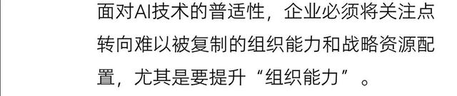 回到巴尼的企业资源观,面对AI技术的普适性,企业必须将关注点转向难以被复制的组织能力和战略资源配置,尤其是要提升“组织能力”。以本文讲述的京东、美团、阿里三方的外卖大战为例,虽然它们都广泛应用AI算法,但胜负的关键并不在于单一的技术,而在于谁能通过更优的组织整合、供应链协同和算法运营,实现高效的用户体验和服务闭环。例如高德扫街榜将AI算法嵌入到独特的入口资源(地图)+ 行为数据 + 信用体系 + “永不商业化”制度承诺,就能让对手无法同样招数回应。因此,企业不仅要将AI算法当作推动效率和体验提升的工具,更要将其与企业内的各种互补性资产结合,与企业独特的运营能力和资本投入协同,这样方能形成独特的、难以还招的新护城河。