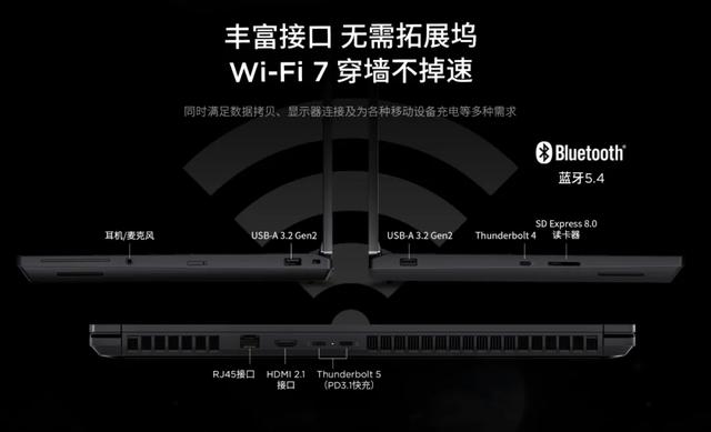在接口方面,全新ThinkPad P16提供了SD8.0读卡器,2个支持180W PD3.1充电的雷电5,雷电4,2个USB-A3.2 Gen2,HDMI2.1,RJ45和音频接口。