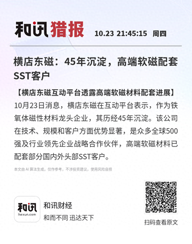 【横店东磁互动平台透露高端软磁材料配套进展】10月23日消息,横店东磁在互动平台表示,作为铁氧体磁性材料龙头企业,其历经45年沉淀。该公司在技术、规模和客户方面优势显著,是众多全球500强及行业领先企业战略合作伙伴,高端软磁材料已配套部分国内外头部SST客户。