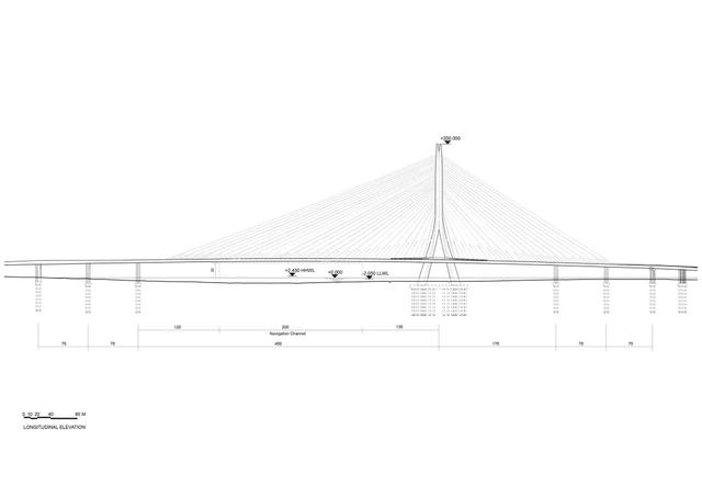 桥梁全长920米,主跨450米,主塔高200米,桥面净宽44.7米,桥下通航净高20米,是世界上最长的单塔式非对称的斜拉桥,总投资约4亿美元,设计使用寿命达120年。
