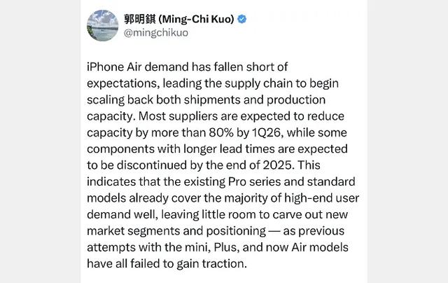 分析师郭明錤在 X 推特上也提到,iPhone Air 确实需求不及预期,导致供应链开始缩减出货量和产能,预计到2026年的第一季度的供应链的产能将减少80%,而一些交货期较长的零部件预计今年停产。