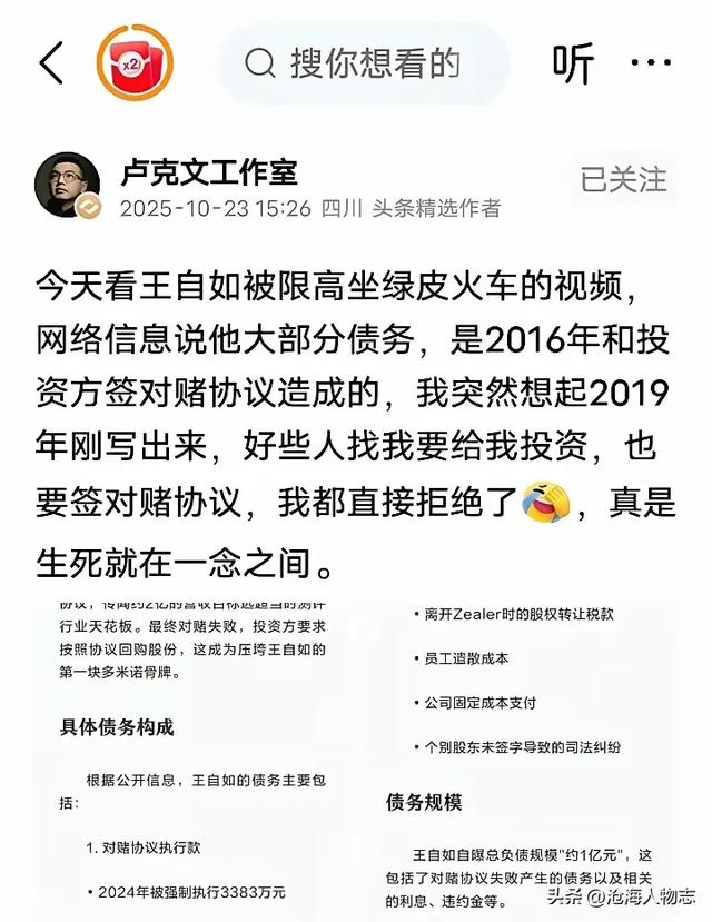王自如这一路简直像部创业警示片:对赌协议的个人无限连带责任能把创始人钉死在债务十字架上;资本催熟的企业就像速成鸡,看着肥美实则虚浮;公众人物一句话说错,分分钟上热搜挨骂。