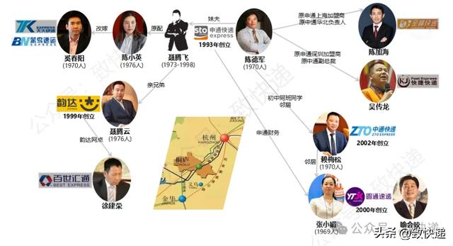 仅拿这几家的创始人老板来说,1993年聂腾飞最早创立申通,1998年车祸去世后创始人团队开始各自创业,聂腾飞的弟弟聂腾云1999年成立韵达,聂腾飞的夫人陈小英和自己的哥哥陈德军接管申通,申通的原财务张小娟和丈夫喻渭蛟2000年成立圆通,陈德军的邻居赖梅松2002年成立中通,张小娟、陈德军、赖梅松还是初中同班同学,包括倒下的天天、快捷、全峰等基本都是桐庐系出去的快递企业。